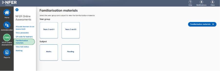 - Select the relevant year group and subject and select ‘Familiarisation materials’