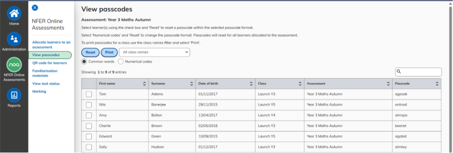 The Print functionality will print passcode details for all learners displaying on the View Passcodes page.