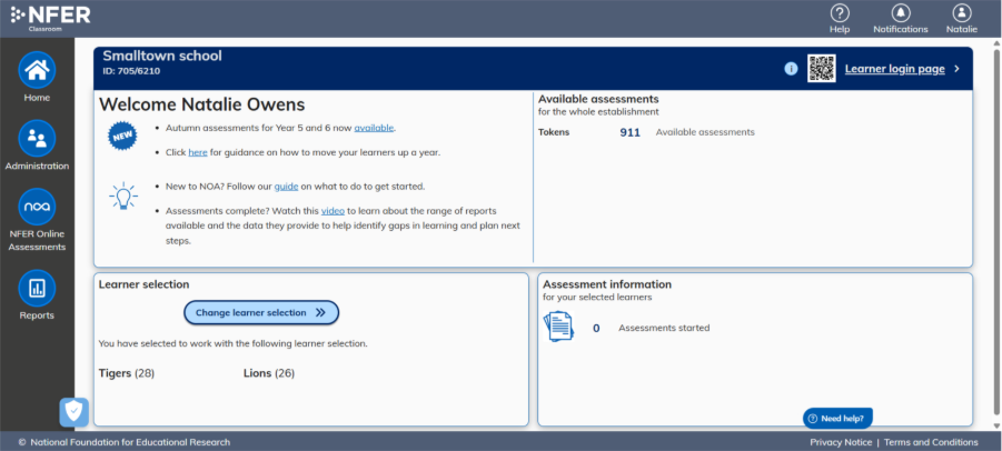 Before accessing teacher marking, the learner selection must be chosen. This can be done from the home screen by selecting the button in the Learner selection box.There are then two ways of accessing teacher marking from the NOA home screen: