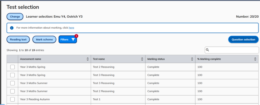 This shows all the tests taken by the chosen learner selection and the marking status for each of these tests – Not started, Started or Complete.