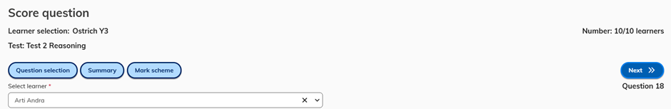 On the screen for the first learner the top left button is Question selection. This button leads back to the Question selection screen to choose a different question to mark or verify.