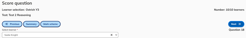 The Score question screen shows the response for one learner at a time and only for learners that have completed the question. If learners have omitted the question, they are automatically scored 0 and do not show in teacher marking.