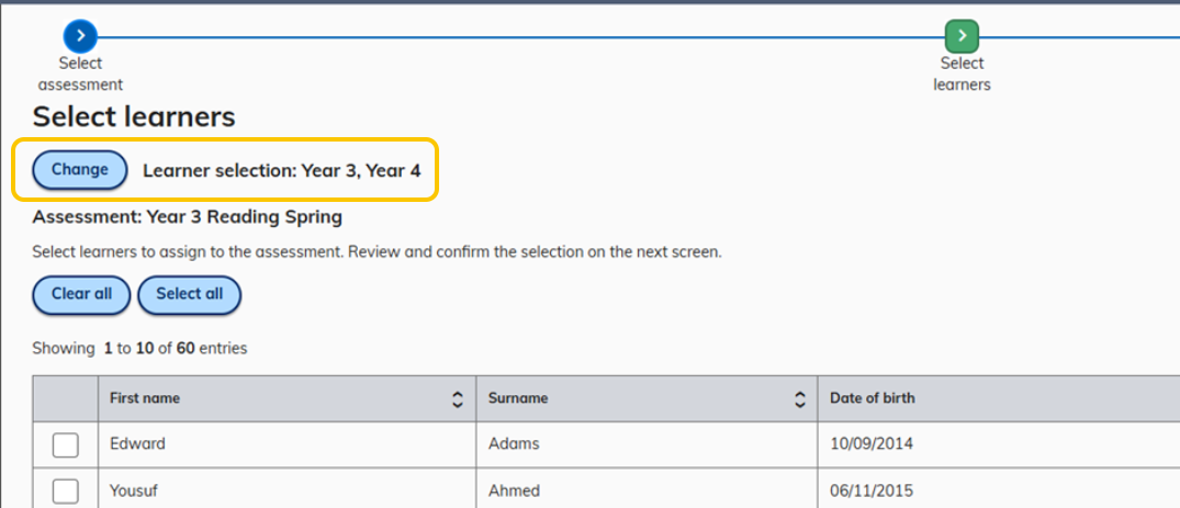 - As a default the system will assume your learner selection is all learners. As a class teacher, for example, you may wish to amend this and set just your class as your learner selection.